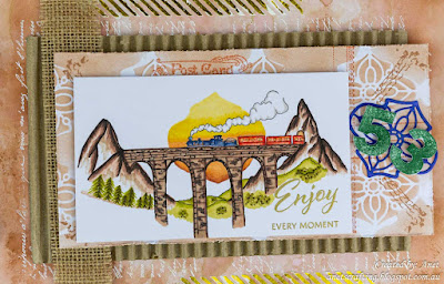 I used colour combinations next to each other on the colour wheel. For inspiration I used a postcard example found on Pinterest and created a vintage panel with the Altenew Enjoy Your Journey Train Stamp.