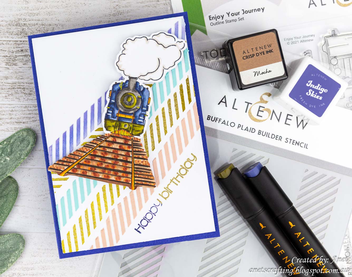 I first coloured the clipboard and was inspired by how Luise Heinzl made it. I adapted it to work with the vintage train postcard panel I made. The rustic clipboard just compliments the Altenew Enjoy Your Journey Train image and let it stand out as focal point.